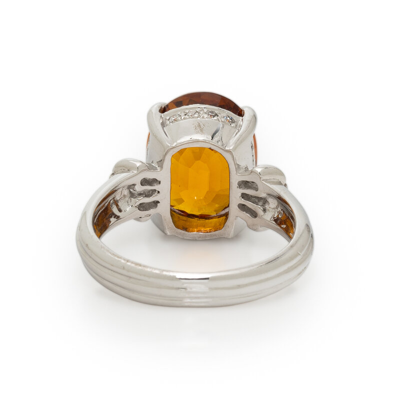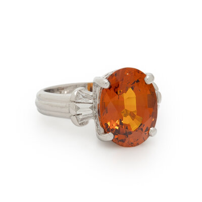 Oval synthetic orange sapphire weighing approximately 6.75 carats by formula, and round and tapered baguette cut diamonds. 18 karat white gold. Ring size 6 1/2.