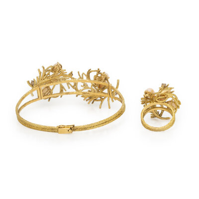 Including a hinged bangle bracelet and a ring, each set with oval and marquise cabochon coral, and round diamonds. 18 karat yellow gold. Bracelet: 6 5/8 inches inner circumference. Ring size 6 1/2.