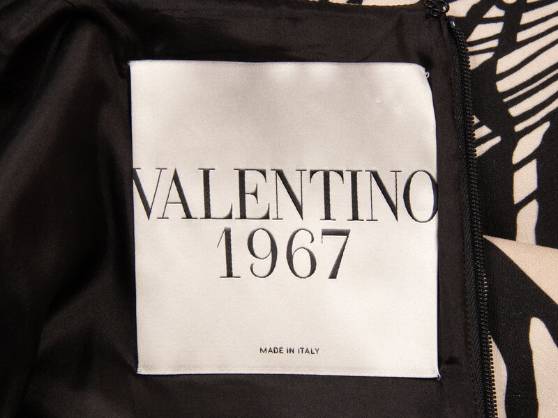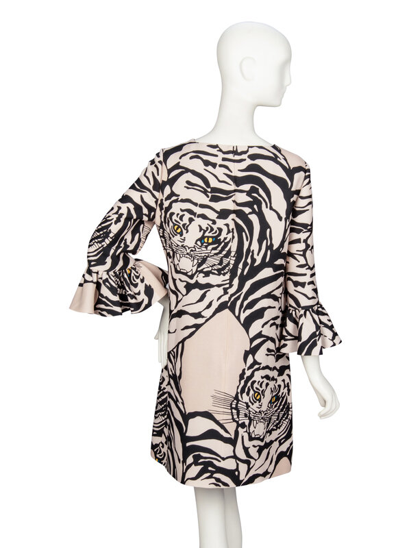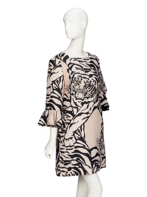 Knee-length shift dress in a tan & black tiger-print wool/silk-blend crepe. Wide squared neckline. Three-quarter-length set-in sleeves with flounces at sleeve hems. Slight A-line silhouette. Invisible zipper closure at back. Fully lined.