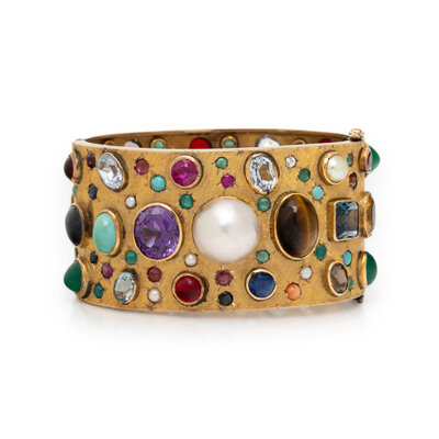 Set throughout with a variety of natural, synthetic, and simulant colored stones, hinged with side clasp. Yellow gold. 6 3/4 inches inner circumference.