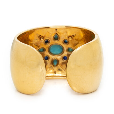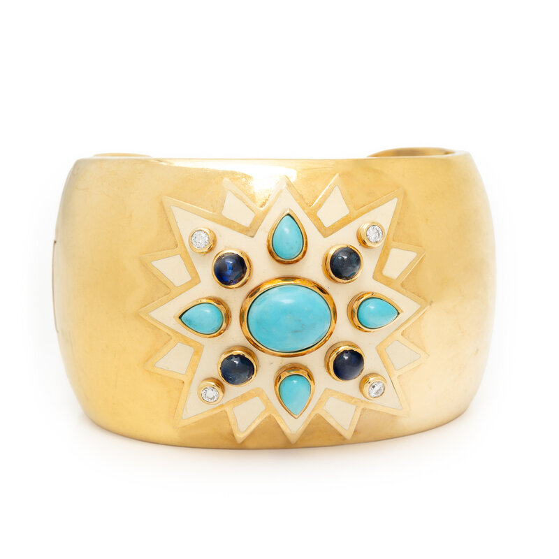 YELLOW GOLD, TURQUOISE, SAPPHIRE, DIAMOND, AND ENAMEL CUFF BRACELET