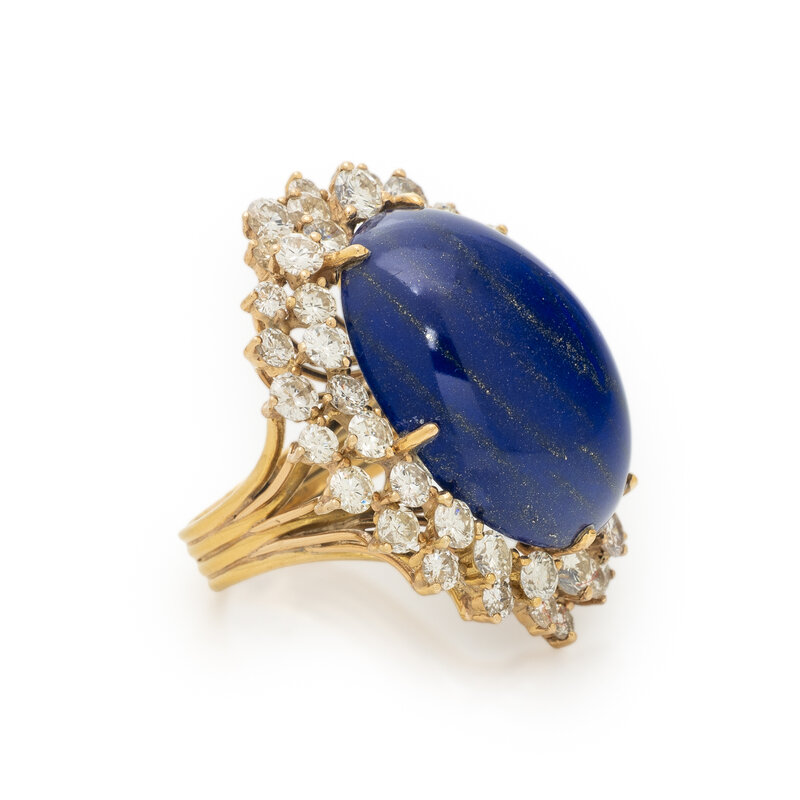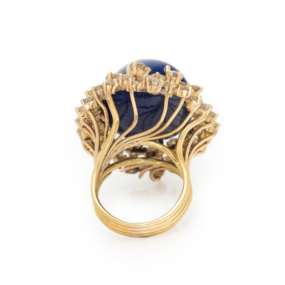 Oval cabochon lapis lazuli measuring approximately 26.00 x 18.60 mm and round diamonds weighing approximately 3.75 - 4.00 carats total. Yellow gold. Ring size 6 1/2.