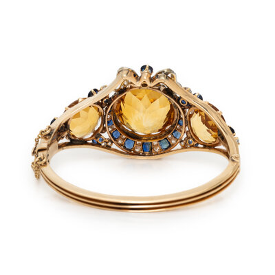 Round and oval sapphires, old European, old mine, and transitional cut diamonds weighing approximately 0.95 carat total, rose cut diamonds, and round citrines, the center citrine weighing approximately 34.00 carats by formula, hinged with side clasp. Rose and white gold. 6 3/8 inches inner circumference.