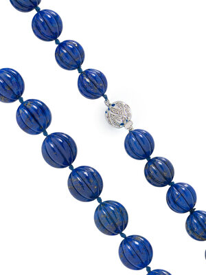 Fluted lapis lazuli beads measuring approximately 16.30 - 19.00 mm and round diamonds. 14 karat white gold. 20 inches long.