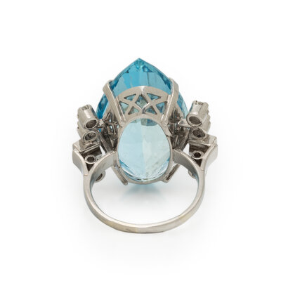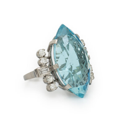 Marquise cut aquamarine weighing approximately 20.00 carats by formula, and round and baguette cut diamonds weighing approximately 0.50 carat total. Platinum. Ring size 6 3/4.