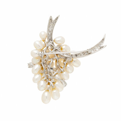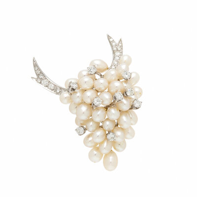 Round diamonds weighing approximately 1.20 carats total, and cultured pearls measuring approximately 4.30 - 5.50 mm. White gold, with 18 karat yellow gold jacket. 2 1/4 x 1 3/4 inches.