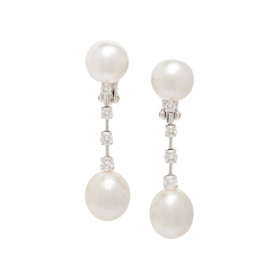 Cultured pearls measuring approximately 10.70 - 11.35 mm and round diamonds weighing approximately 0.90 carat total. 18 karat white gold. 1 5/8 inches long.