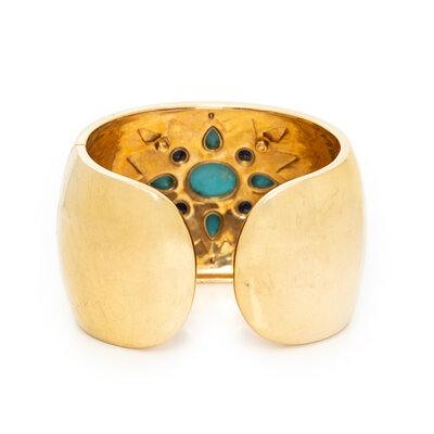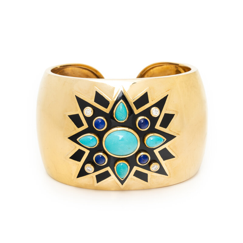 TURQUOISE, LAPIS LAZULI, DIAMOND, ENAMEL, AND YELLOW GOLD CUFF BRACELET