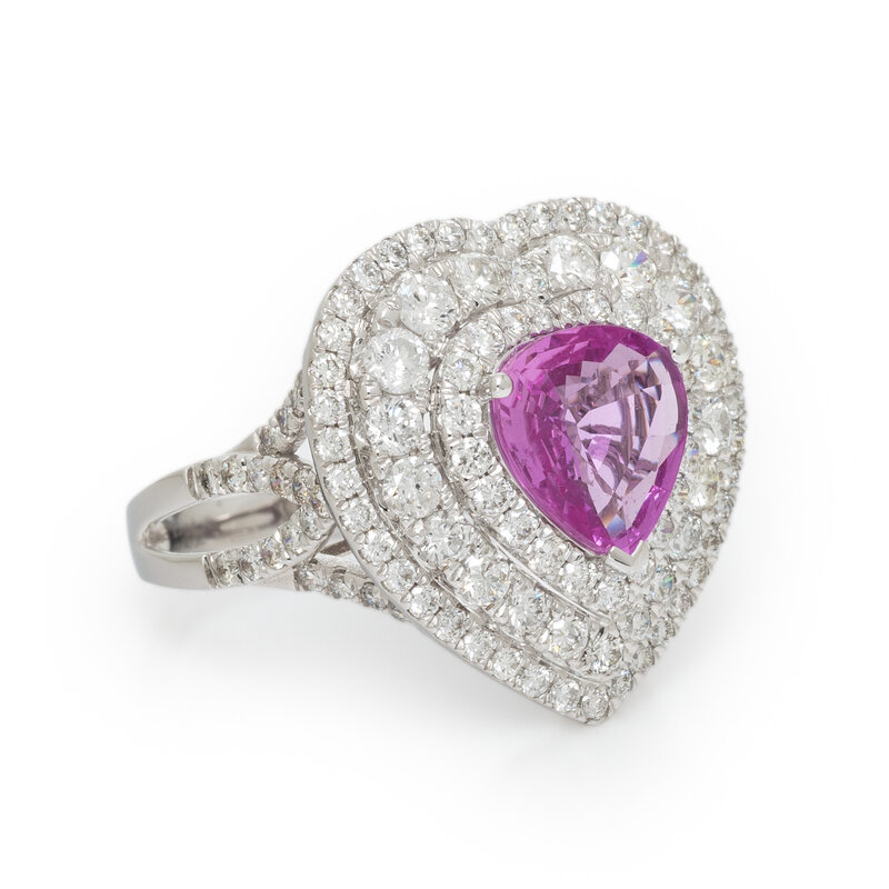 Pear shape pink sapphire weighing approximately 2.25 carats and round diamonds weighing approximately 1.75 carats total. 18 karat white gold. Ring size 7.