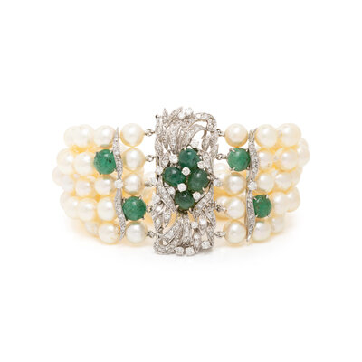 Cultured pearls measuring approximately 6.75 - 7.20 mm, round and single cut diamonds weighing approximately 1.95 carats total, and round and oval cabochon emeralds. White gold. 7 1/8 inches long, 1 3/8 inches wide.