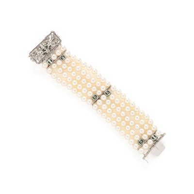 CULTURED PEARL, EMERALD, DIAMOND, AND PLATINUM BRACELET