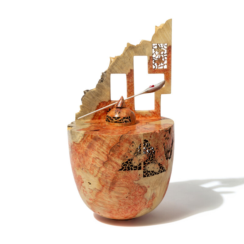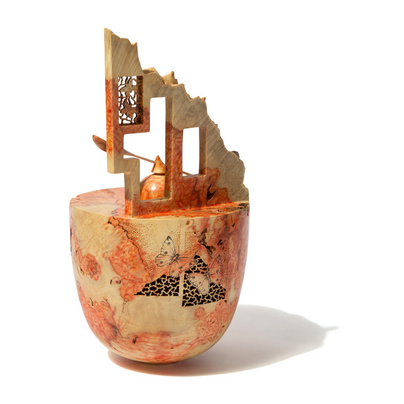 Mixed wood, including box elder burl, reticulated bowl with cover