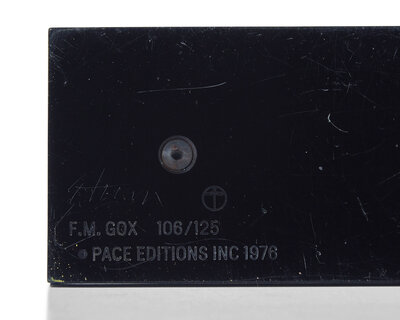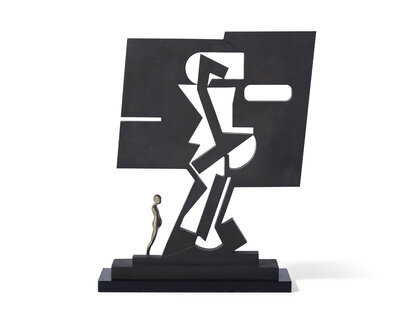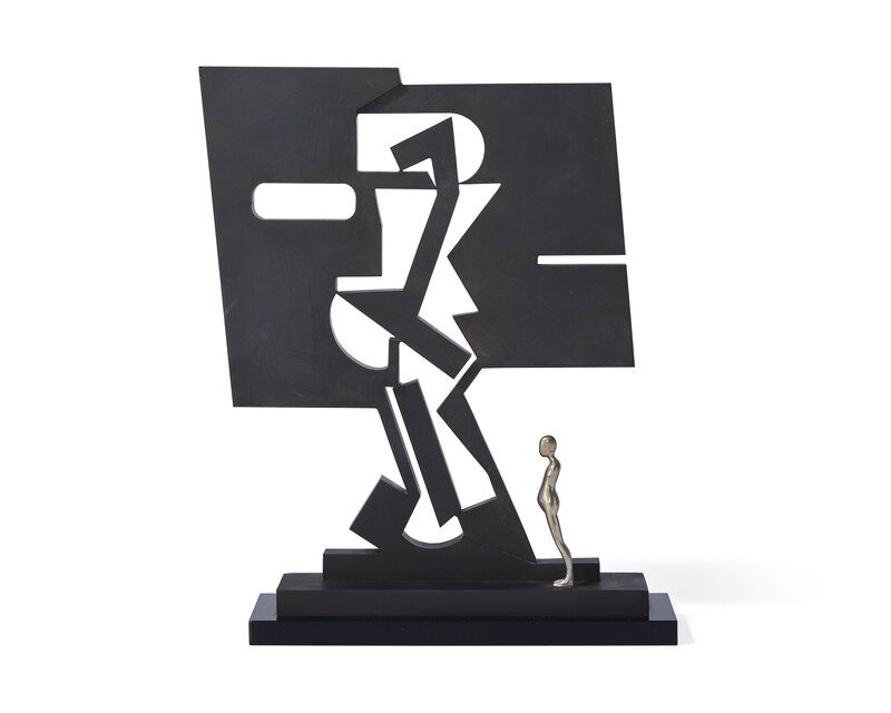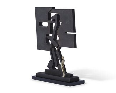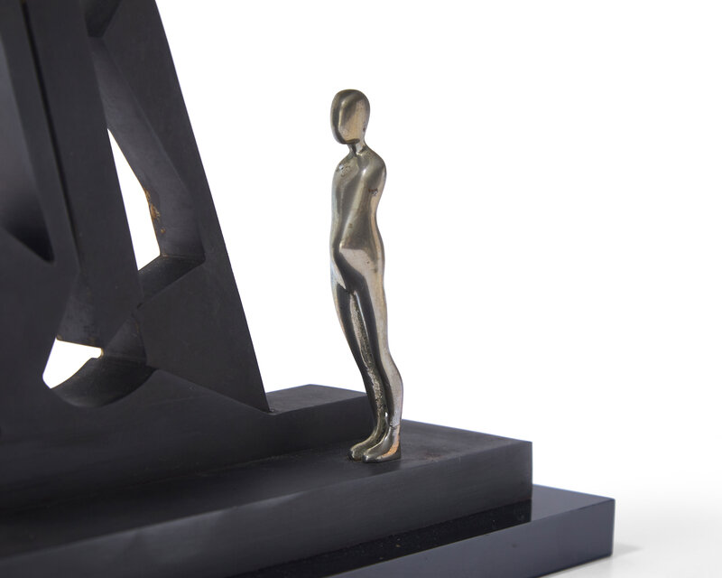 cold-rolled steel finished in black oxide with white bronze figure on acrylic base