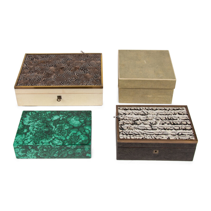 variously covered in shagreen, malachite, and feathers; three by R+Y Agousti.