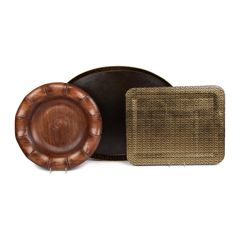 comprising a wooden example, a Regency style black tole example, and a Fornasetti Greek key patterned example.