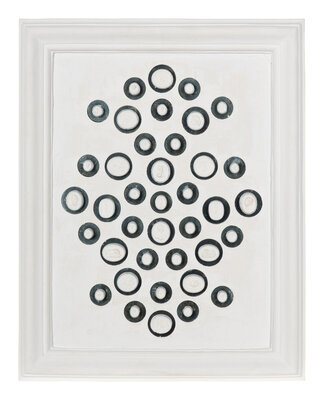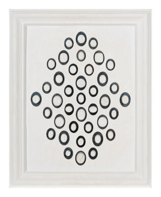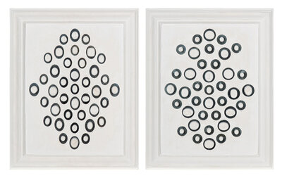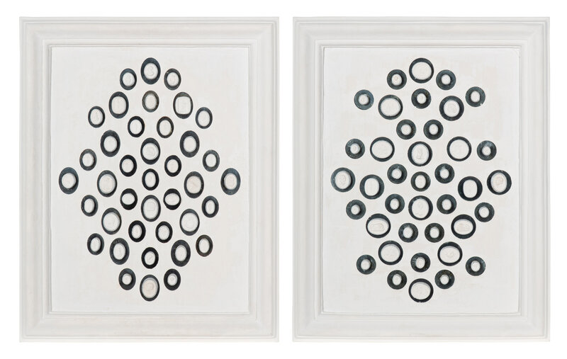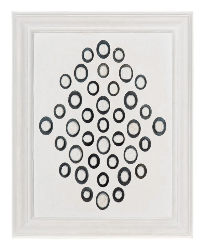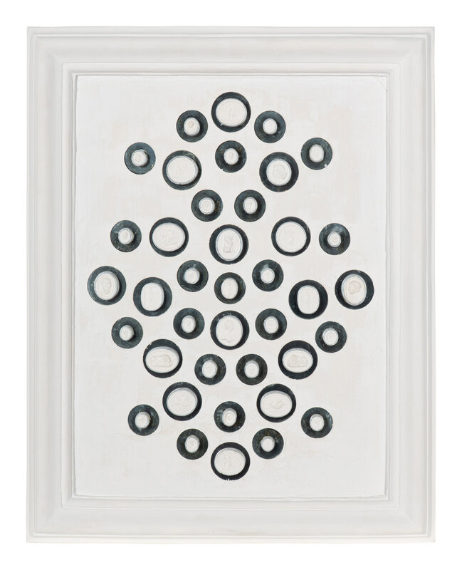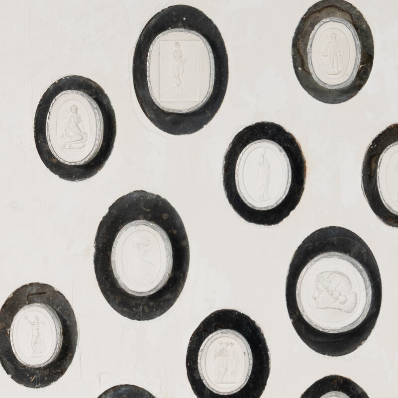 each intaglio mounted against a mirrored back and set as two collections in white plaster frames.