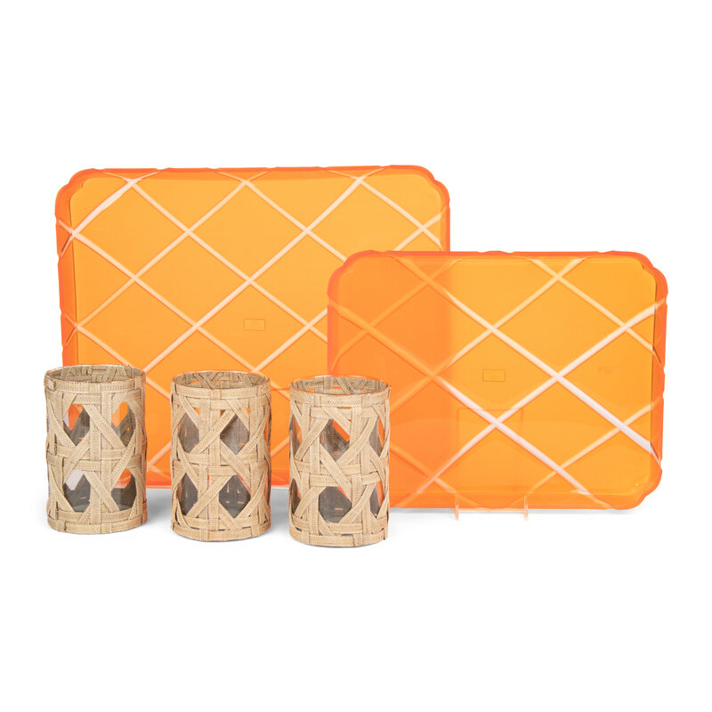 comprising a set of three abaca fiber and glass hurricane vases, two Italian orange acrylic trays, and a pair of cerused oak candle stands; 7 items total.