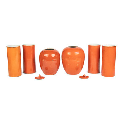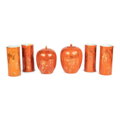 A Collection of Chinese Gilt Decorated Orange-Ground Porcelain Vases and Ginger Jars