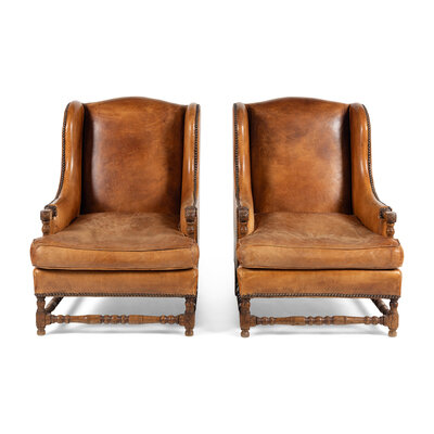 A Pair of Louis XIII Style Oak and Leather Wingback Armchairs