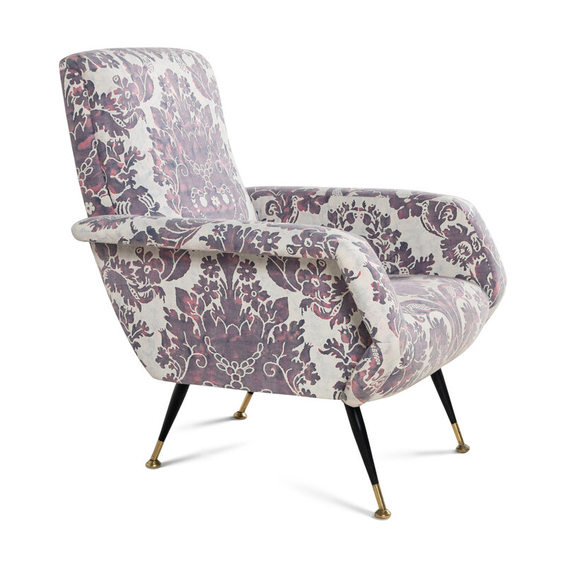 steel, brass, Fortuny upholstery
