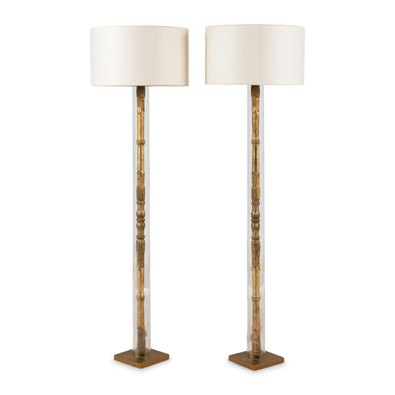 A Pair of Continental Carved Giltwood, Glass and Brass Floor Lamps