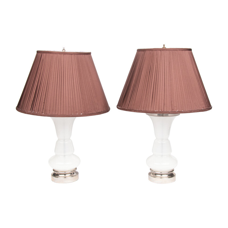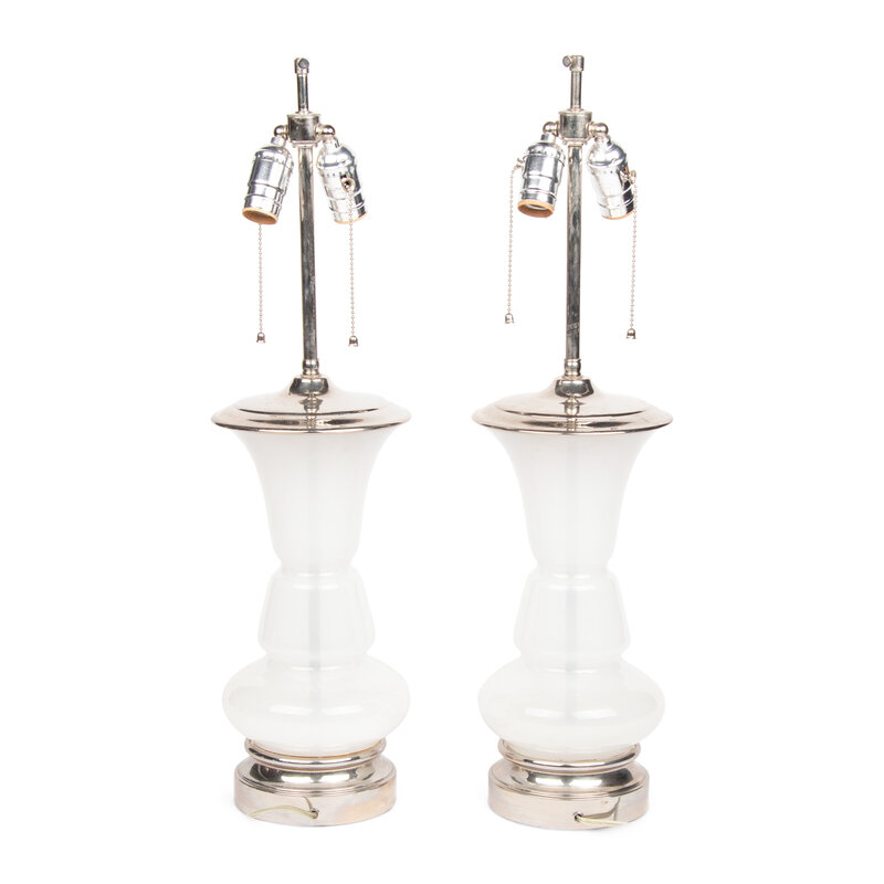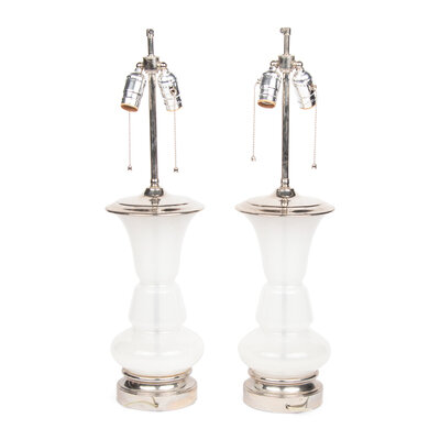 A Pair of White Opaline Glass and Nickel-Plated Table Lamps