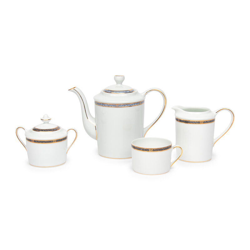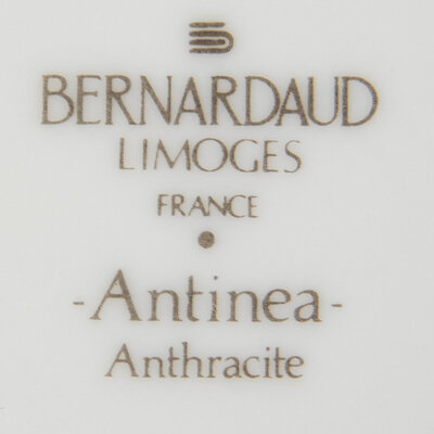 Antinea Anthracite pattern, comprising 1 coffee pot, creamer, covered sugar, four coffee cups, six shallow bowls, and a covered tureen.