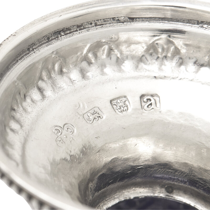 with repousse medallions and swagged garland, one medallion engraved with armorial crest in the form of a dog, fitted with a cobalt glass liner.