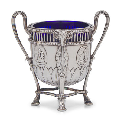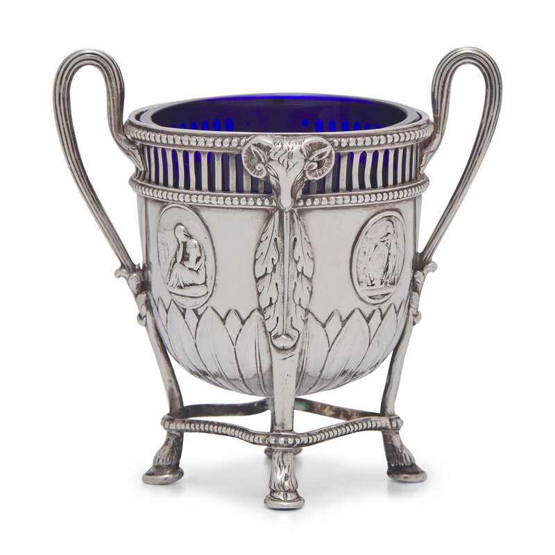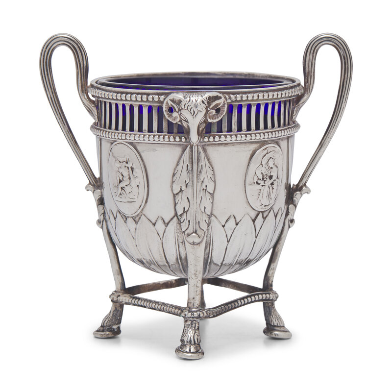 with two handles, the body cast and chased Neoclassical motifs including ram heads and roundels depicting mythological figures, the base with leafage, on four hoof-form feet, fitted with a cobalt glass liner, marked.