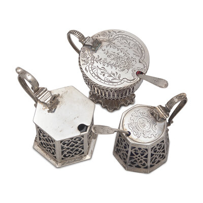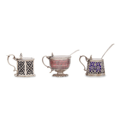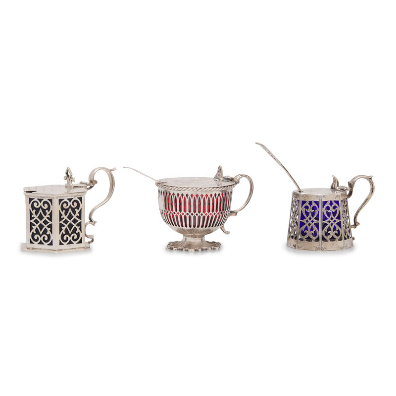 Three English Pierced Silver Mustard Pots and Two Silver Mustard Spoons