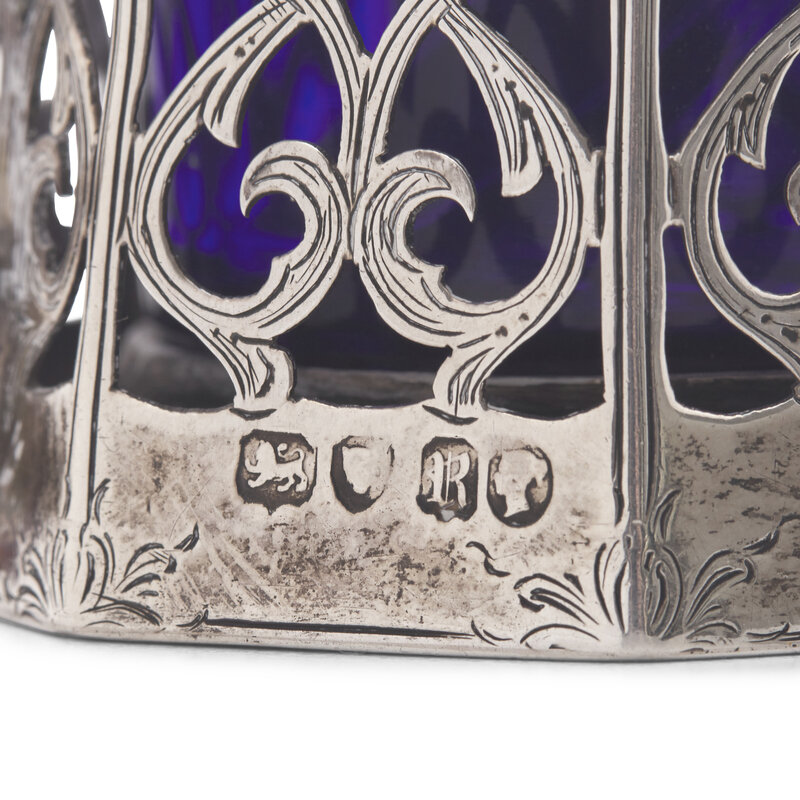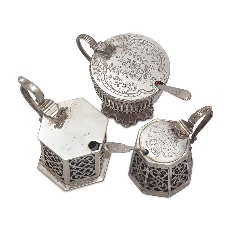 comprising a mustard pot of tapered and octagonal form, by Charles Thomas Fox & George Fox, London, 1852, the lid engraved with monogram, "TJC", fitted with cobalt glass liner, marked; a round mustard pot with foliate base, by Thomas Bradbury & Sons, Sheffield, 1857, the lid engraved with floral and foliate motifs, fitted with a red glass liner, marked; and pot of hexagonal form, by maker "JT", possibly John Tongue of Birmingham, possible date mark of 1832, marked; fitted with a cobalt glass liner; and two mustard spoons, the first, by William Seaman, London, 1815, the handle end engraved with armorial crest in the form of a goat head within crown, marked; the second, by Charles Hougham, London, 1789, with bright-cut decoration, marked.