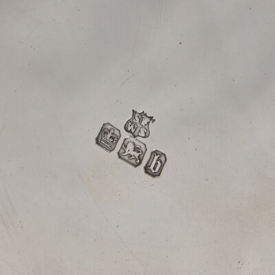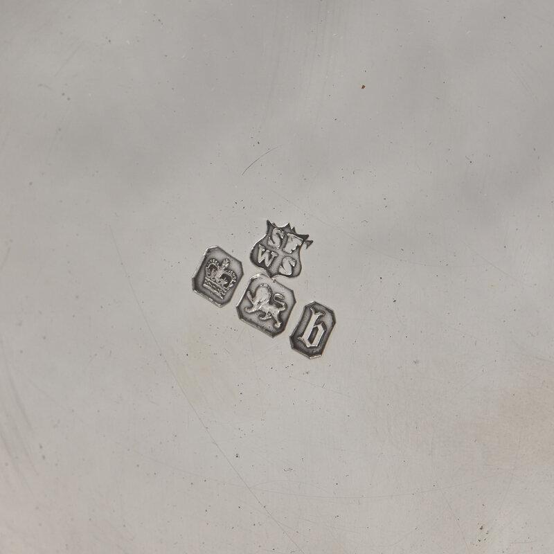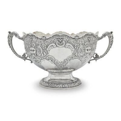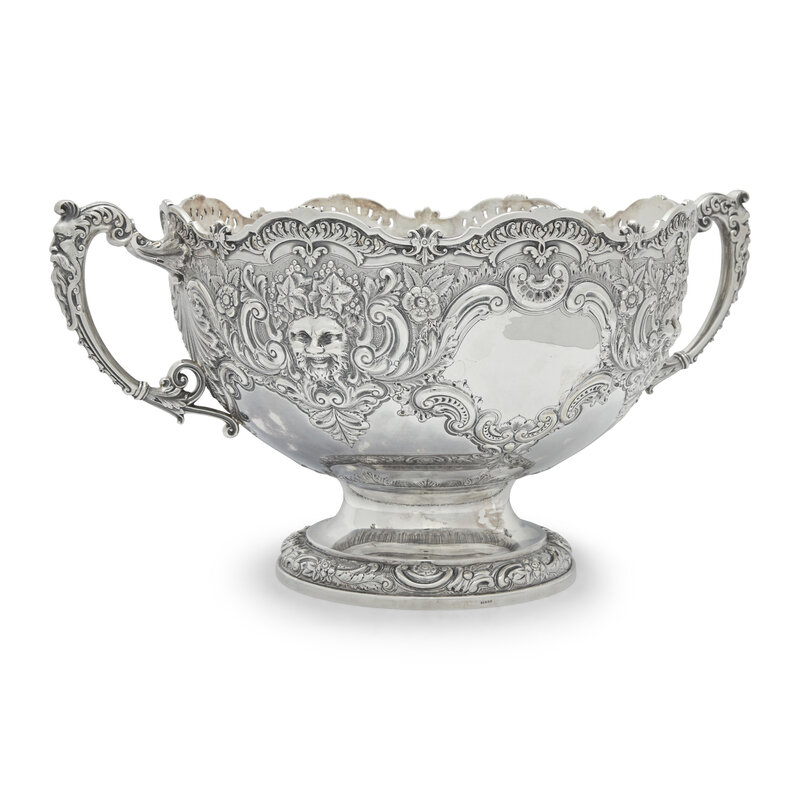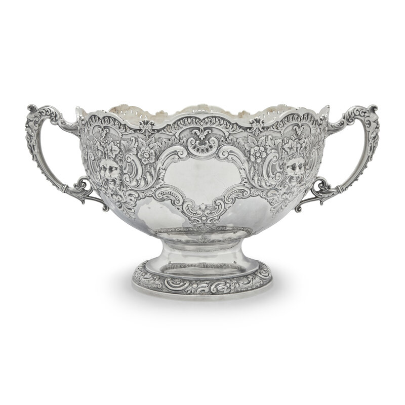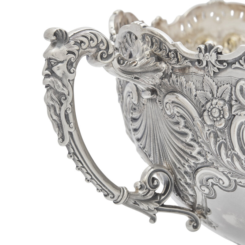 retailed by Birks, Canada; with pierced rim, the scrolled handles cast with bearded masques, the body decorated with repousse foliate motifs and Bacchic masques, on footed base.