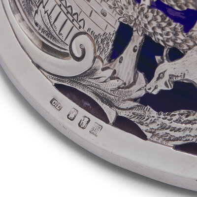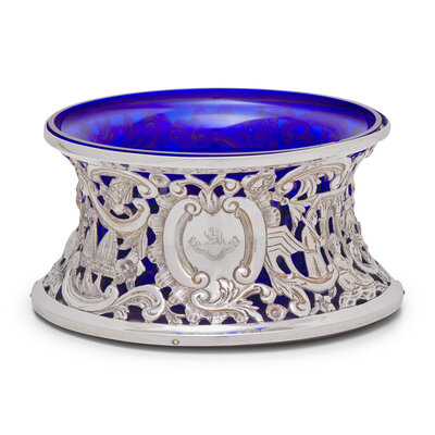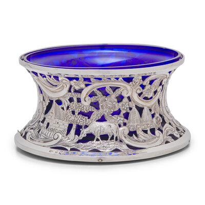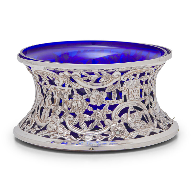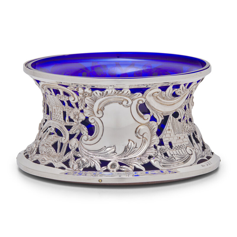 the body with repousse motifs including bucolic scene comprising houses, trees, haystacks, a cow, a duck, and Chinoiserie figures, interspersed with floral and foliate motifs and surrounding two rococo reserves, one engraved with armorial crest in the form of a griffin and banner inscribed with motto, "Turris Fortis Mihi Deus", with ring-turned mahogany base, fitted with cobalt glass liner.