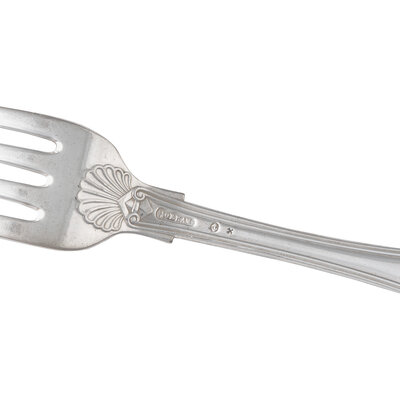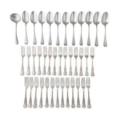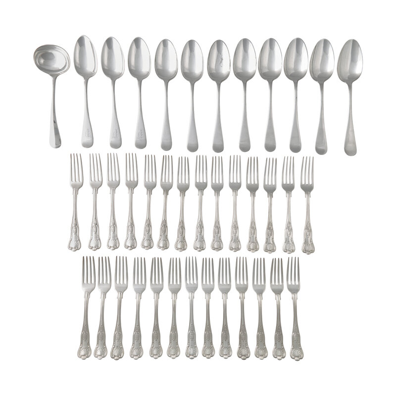comprising eleven tablespoons by Rogers Bros., three engraved with monogram, "P", marked; twenty-seven dinner forks in the "King" pattern, by Gorham, marked; and a single sauce ladle, marked, "S.G", "England", and "EPNS A1."