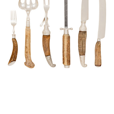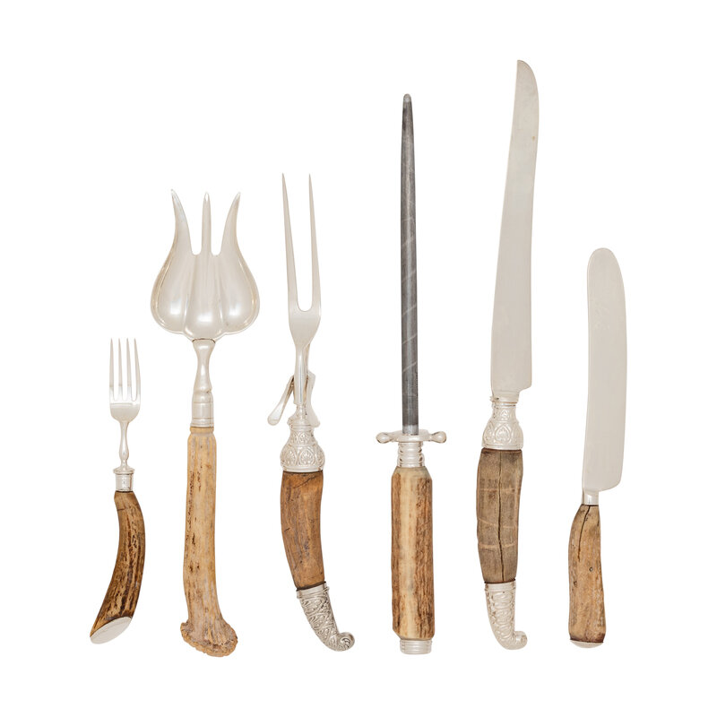 comprising a carving knife and fork, a honing rod, a large serving fork, a small fork, and a cake knife; 6 pieces total.