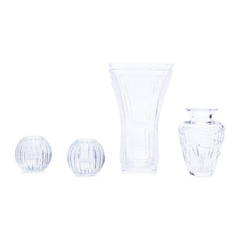 comprising a Waterford cut glass baluster vase, an unmarked taller vase, and a pair of unmarked votive holders.