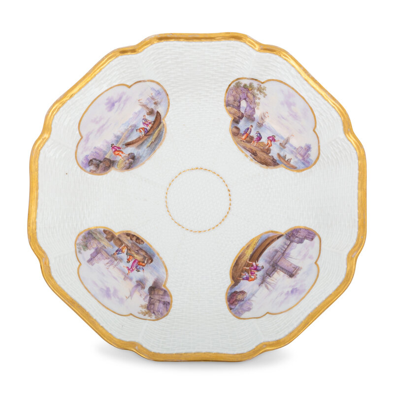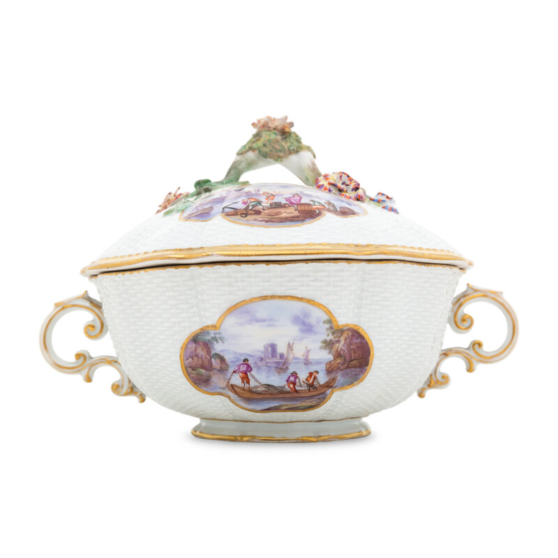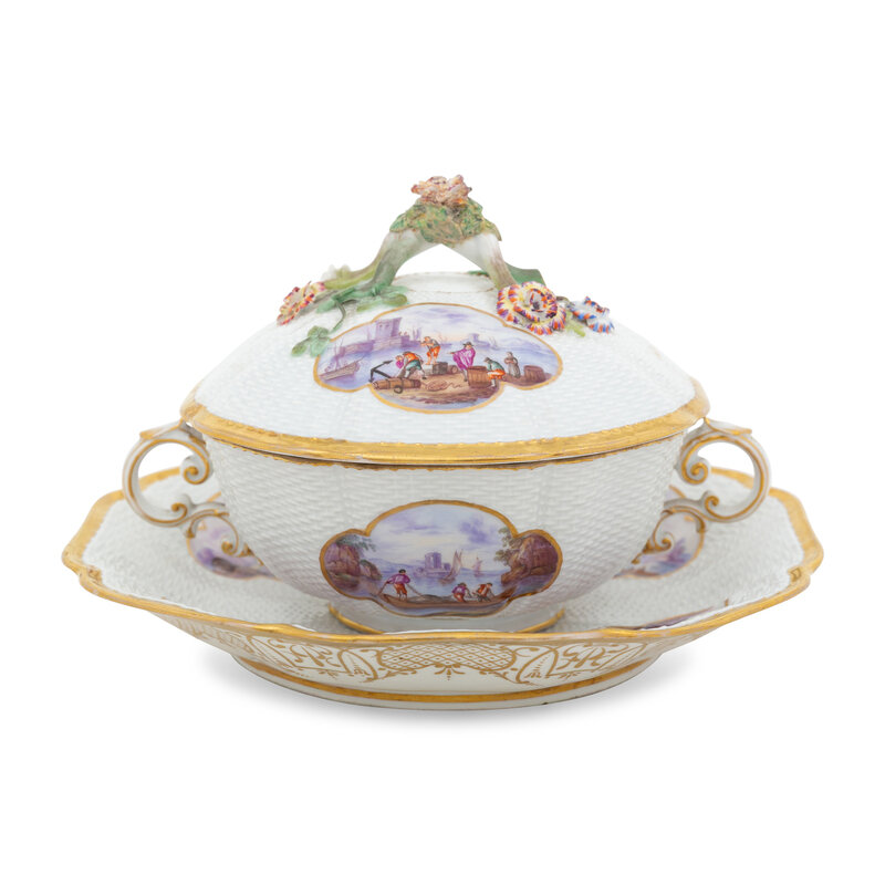 A Meissen Porcelain Ozier-Molded Scenic Tureen with Stand