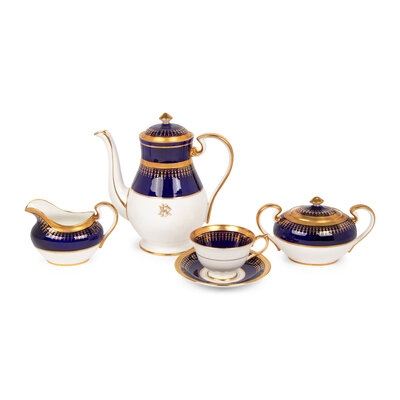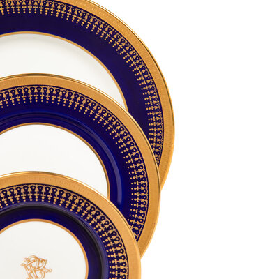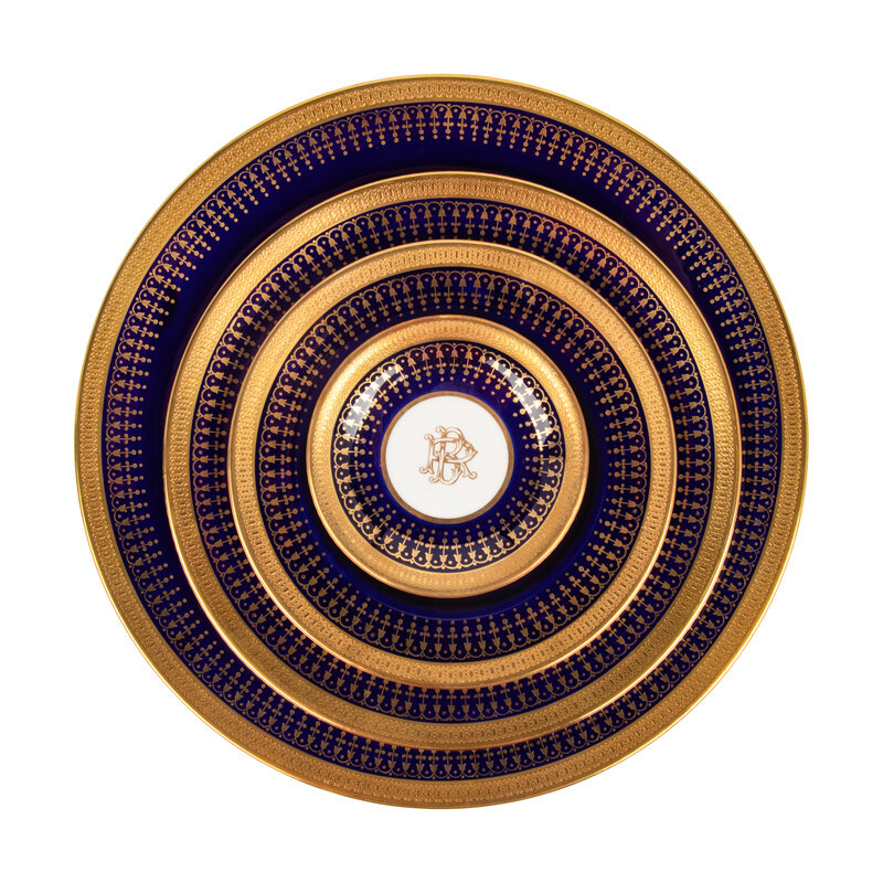 with cobalt and git decoration, with gilt RB or BR monogram to center of most, comprising: