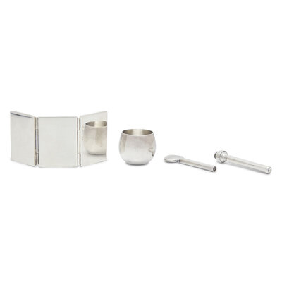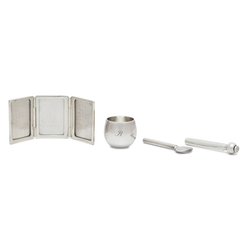 comprising a tri-fold picture frame, a medicine cup, engraved with monogram, "B", and a feather-form pen; all marked, the frame also marked "Mexico"; together with a weighted sterling silver implement, marked "Duchin Creation".