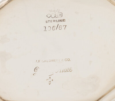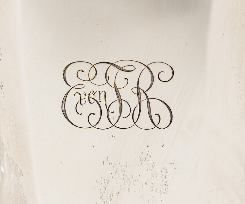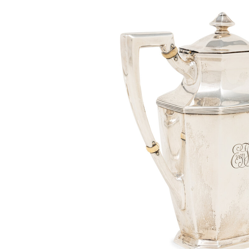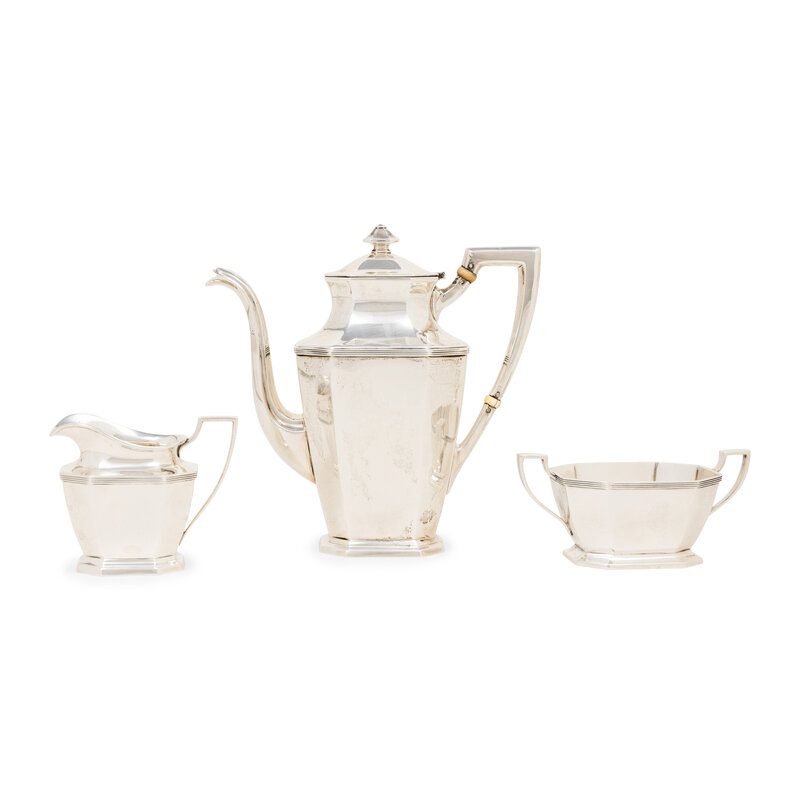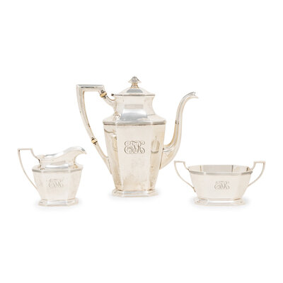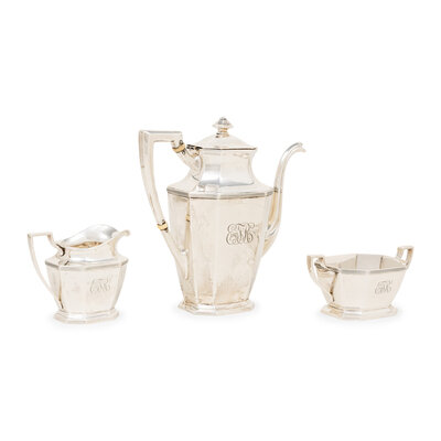 Queen Anne pattern with an engraved monogram to each item and comprising a coffee pot, creamer and sugar.