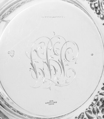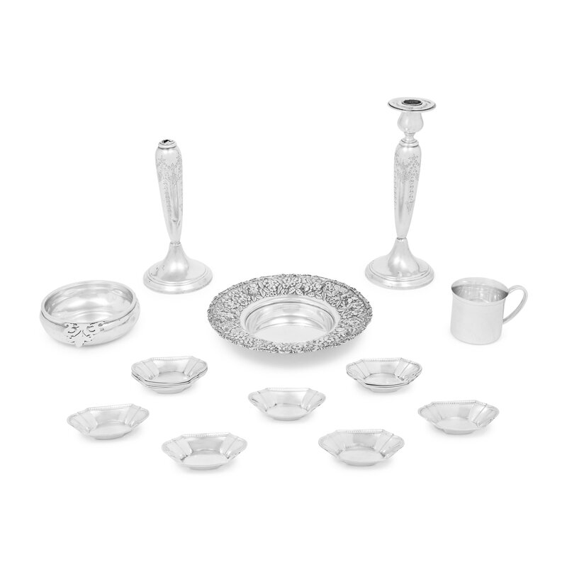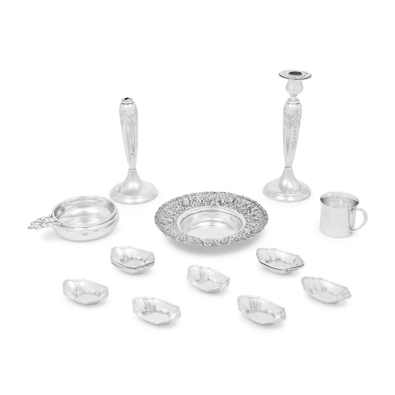 comprising a repoussé bowl by Baltimore Sterling Silver Co.; 15 nut dishes by Wallace; a christening cup by Lunt; a porringer by Shreve & Co; and a pair of candlesticks (one with its candle cup detached); 20 items total.