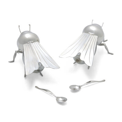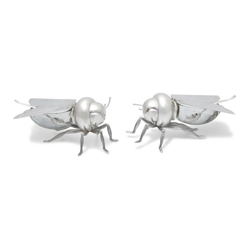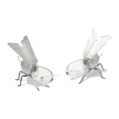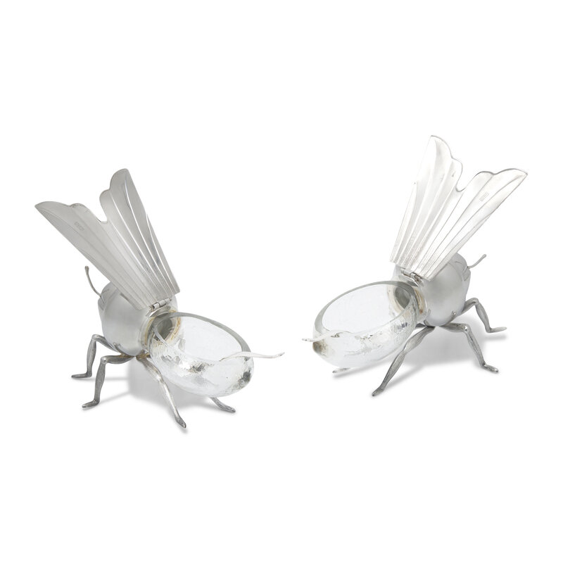 A Pair of Peruvian Silver and Glass Bee-Form Honey Dishes and Spoons