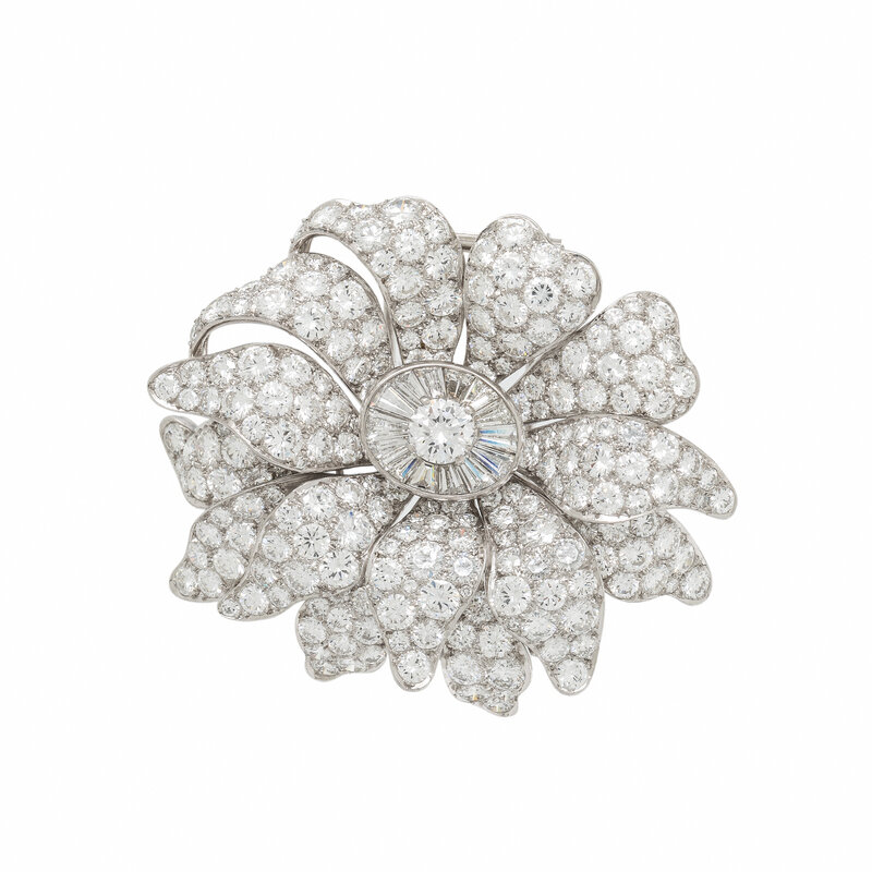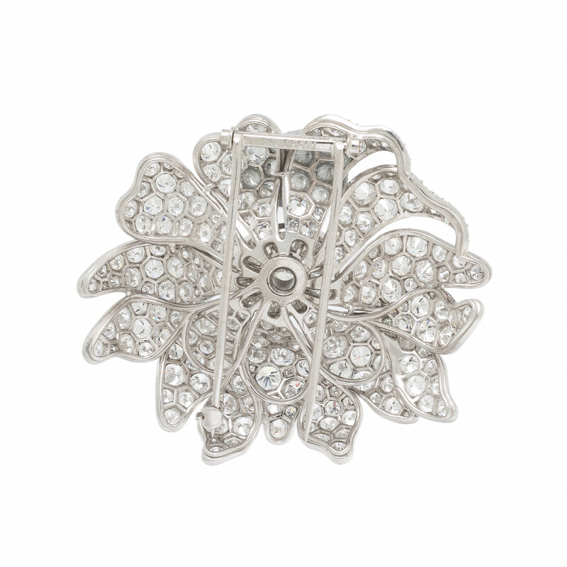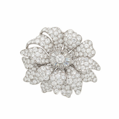Designed as a flower, richly set with round and tapered baguette cut diamonds weighing approximately 20.00 - 22.00 carats total. Mounted in platinum. 2 x 1 3/4 inches.