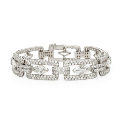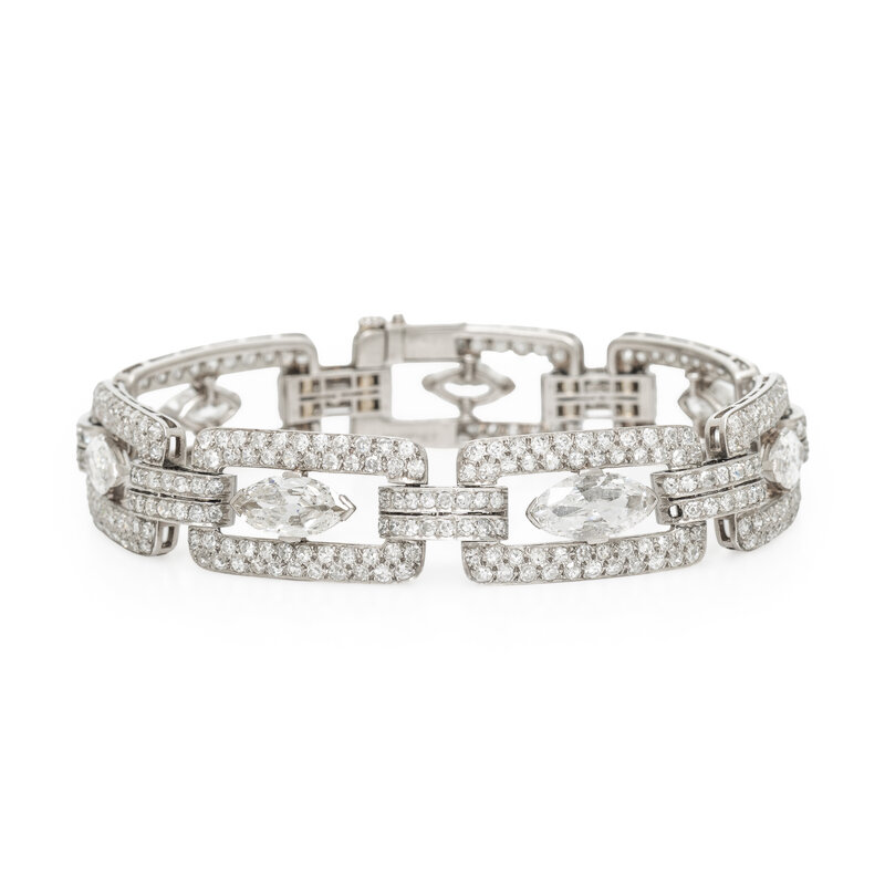 Designed with rectangular links, featuring seven marquise cut diamonds weighing approximately 6.50 - 7.00 carats total, framed by single cut diamonds weighing approximately 6.00 carats total. Mounted in platinum. 7 1/4 inches long.