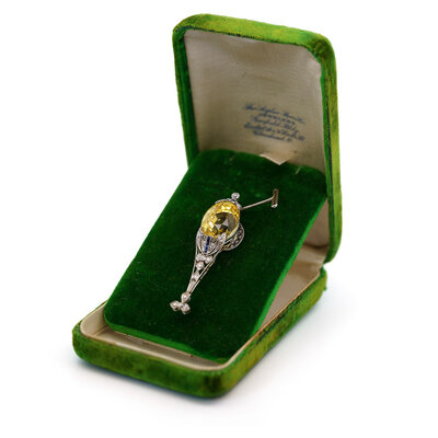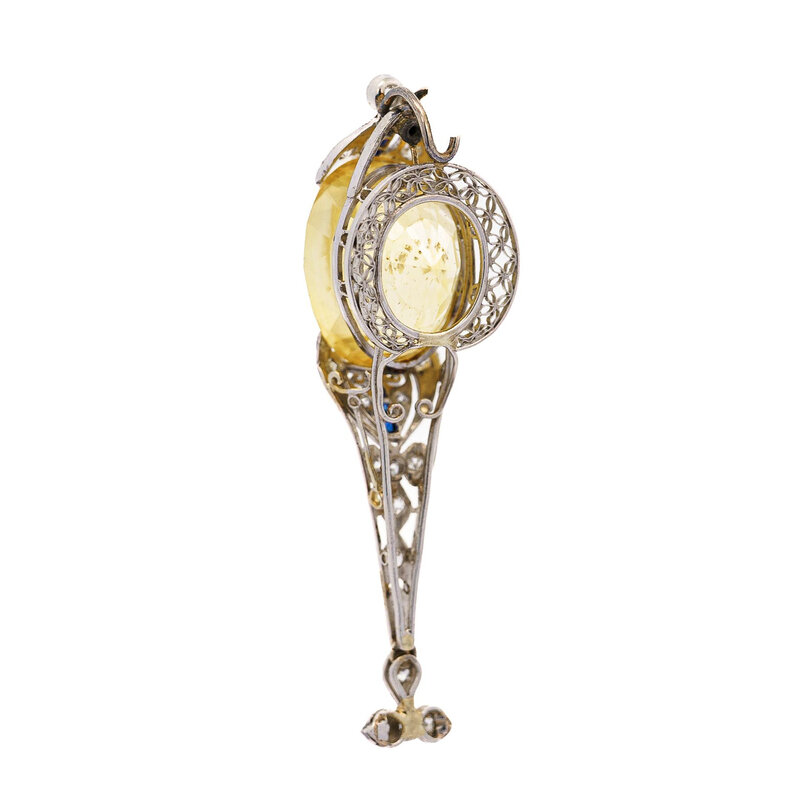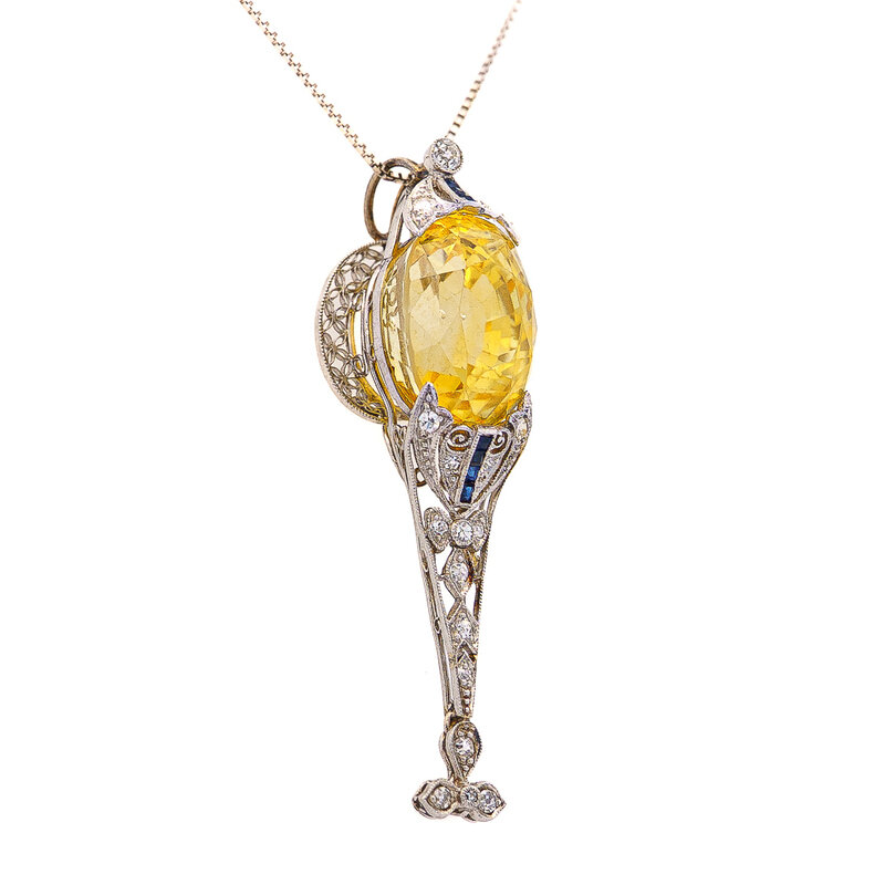 Featuring an oval yellow sapphire measuring approximately 20.00 carats by formula mounted in a filigree setting with calibré-cut sapphires, and old European and single cut diamonds weighing approximately 0.34 carat total. Mounted in platinum. 2 x 1/2 inches.