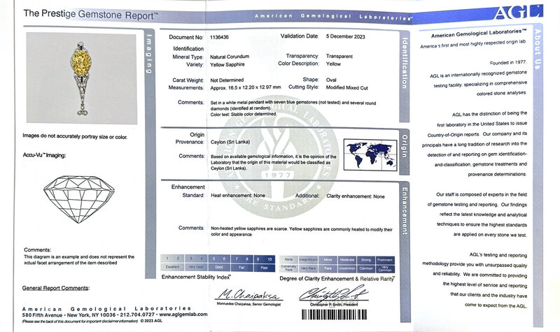 AGL, 2023, Report No. 1136436, Natural Corundum, Yellow Sapphire, Ceylon (Sri Lanka), No Heat