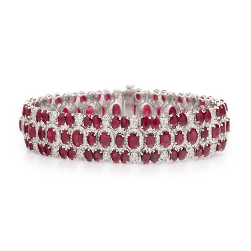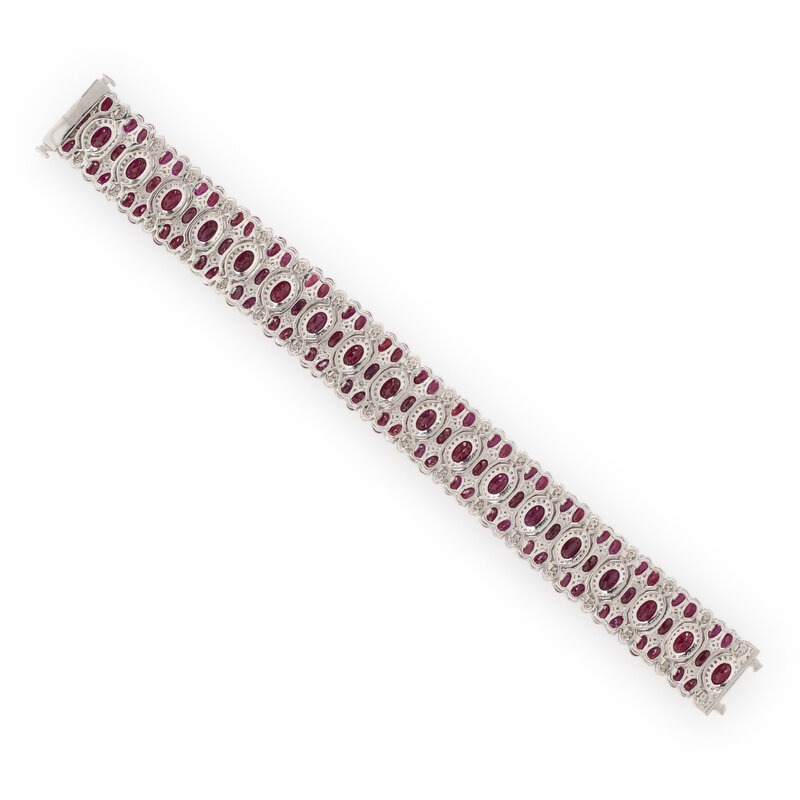 Designed with flexible links and set throughout with oval rubies weighing approximately 32.99 carats total and round diamonds weighing approximately 4.55 carats total. Mounted in platinum. 7 inches long 5/8 inch wide.