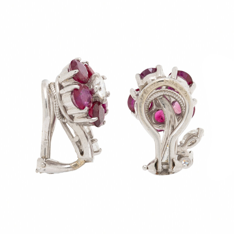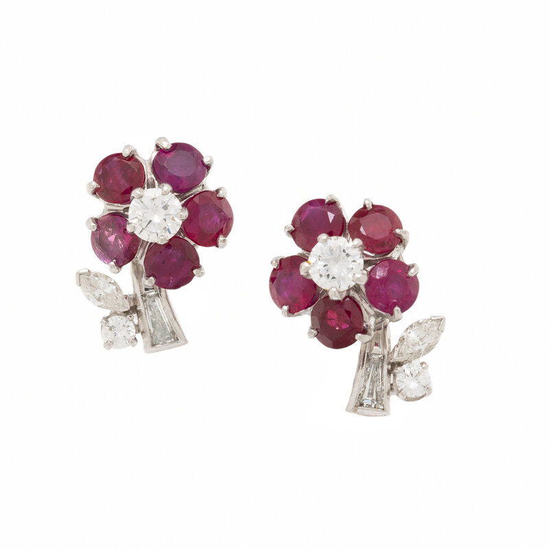 J.E. CALDWELL & CO., RUBY AND DIAMOND FLOWER EARRINGS