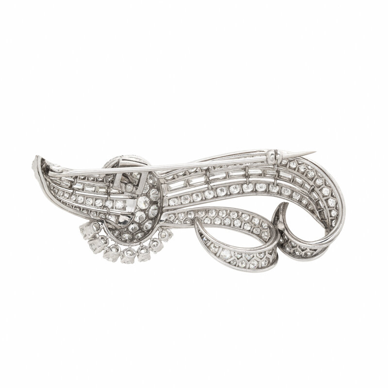 In a ribbon design, set throughout with swirls of old European, transitional, single, and baguette cut diamonds weighing approximately 7.45 carats total. Mounted in platinum. 2 1/2 x 1 inches.