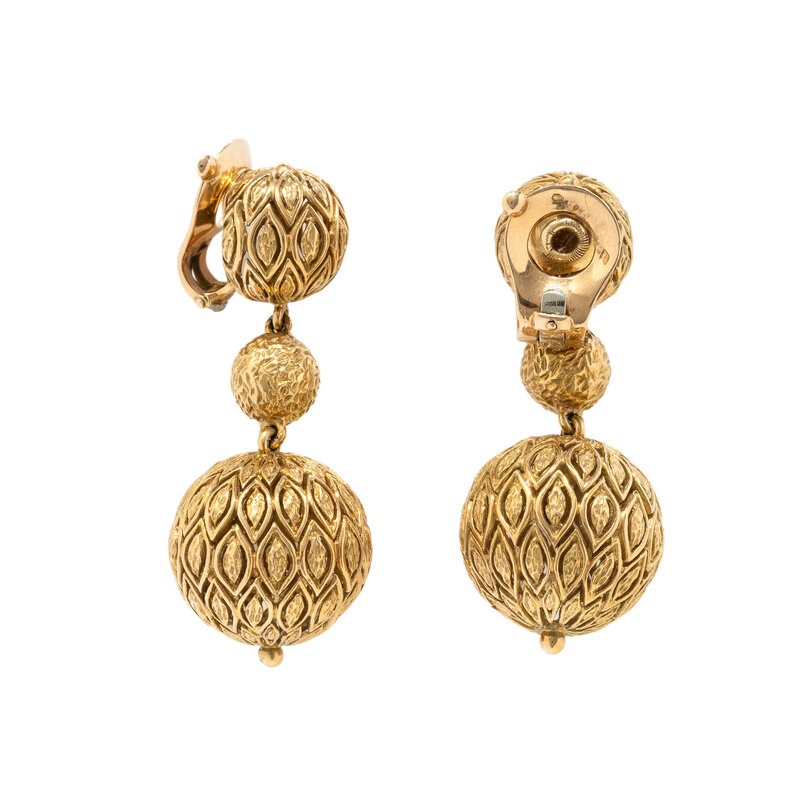 Designed with patterned openwork motifs and a textured finish. 18 karat yellow gold. 1 7/8 inches long.
